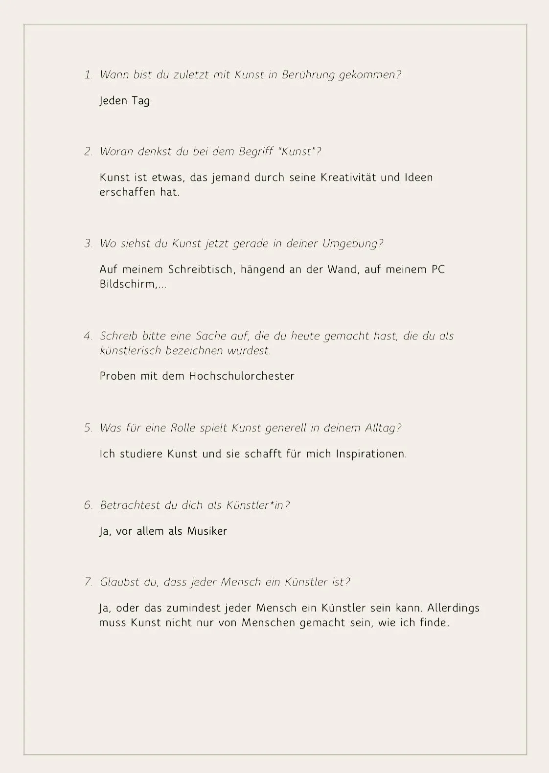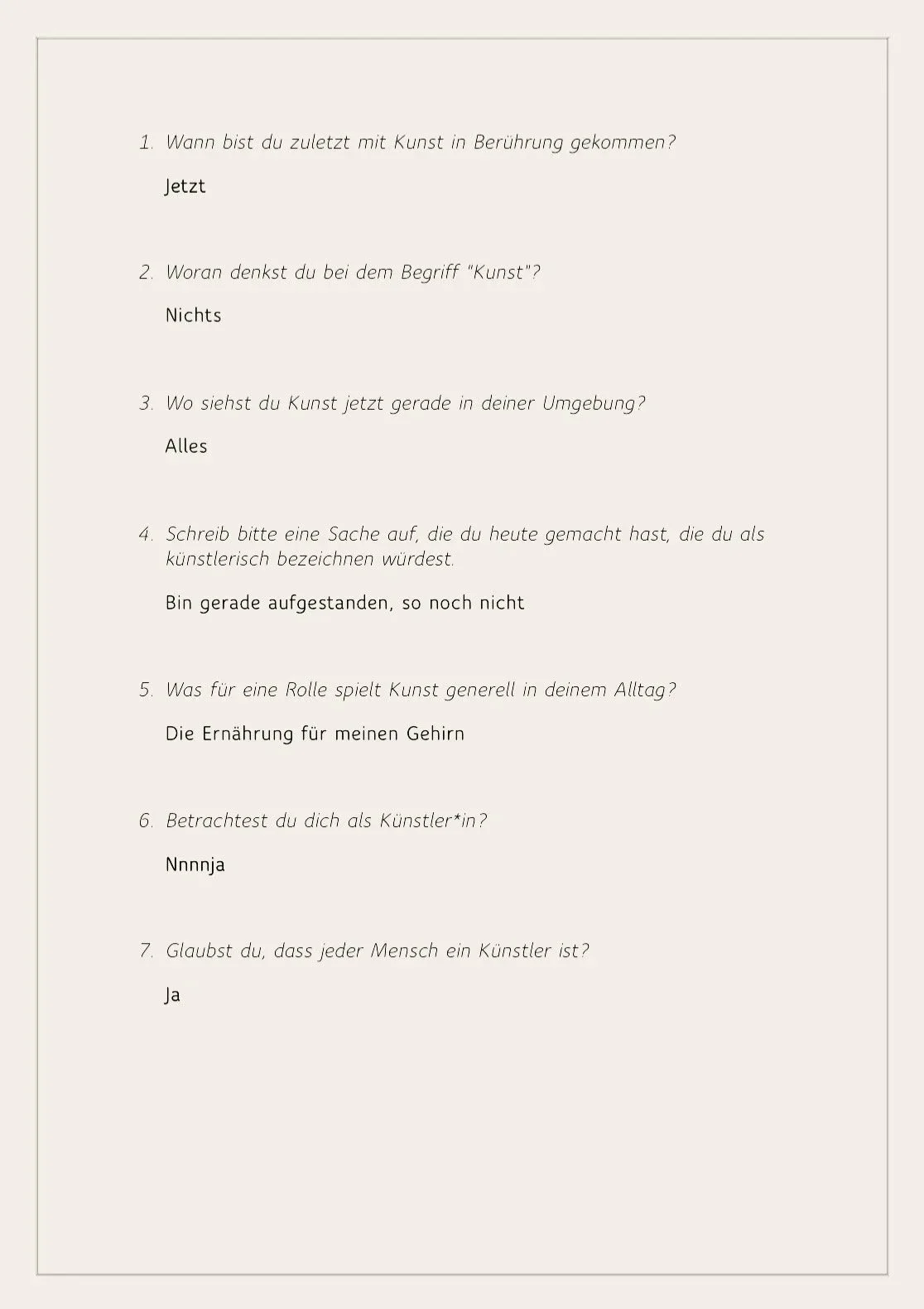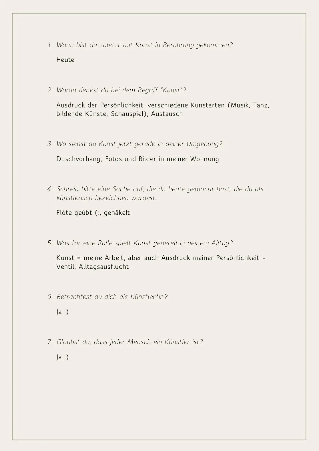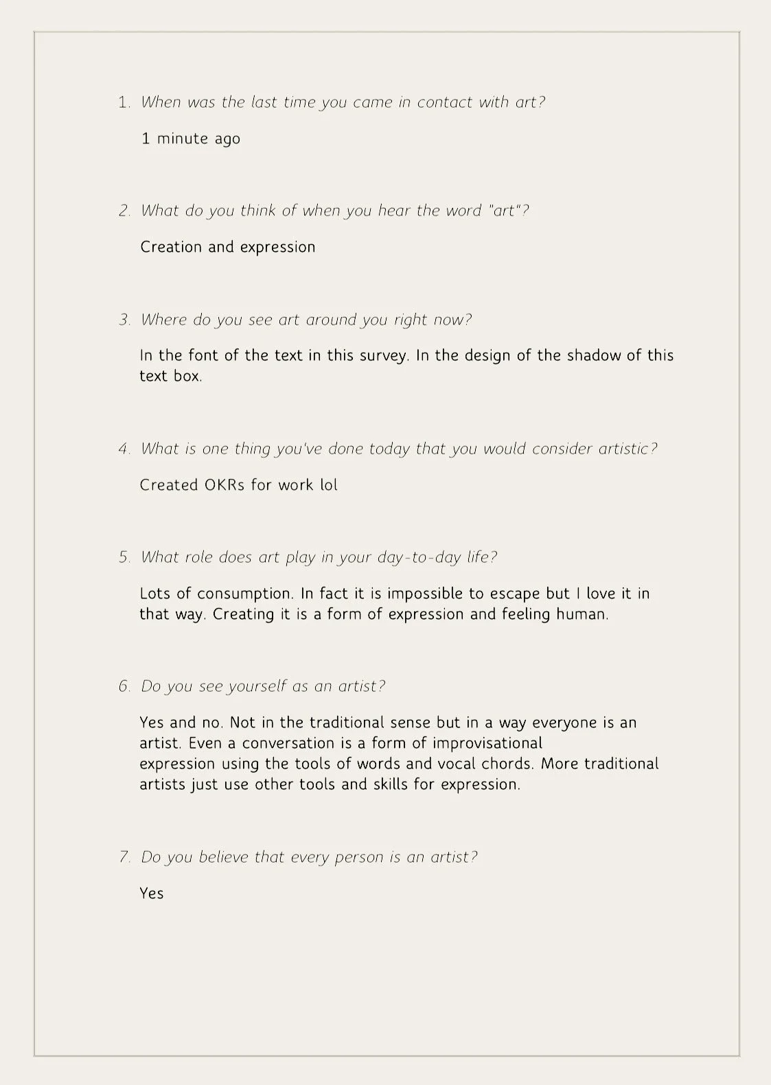 Diese Zeichen von Kunst auf der Straße deuteten für mich auf eine künstlerische Ader in allen Menschen hin. Aber ich wollte mit Menschen in Kontakt treten und ihre Perspektiven dazu einholen. Sehen sich Menschen generell als Künstler, und wenn nicht, an welchen künstlerischen und kreativen Aktivitäten nehmen sie dann täglich teil? Um diese Fragen zu beantworten, habe ich eine Online-Umfrage erstellt, in der ich Folgendes gefragt habe: