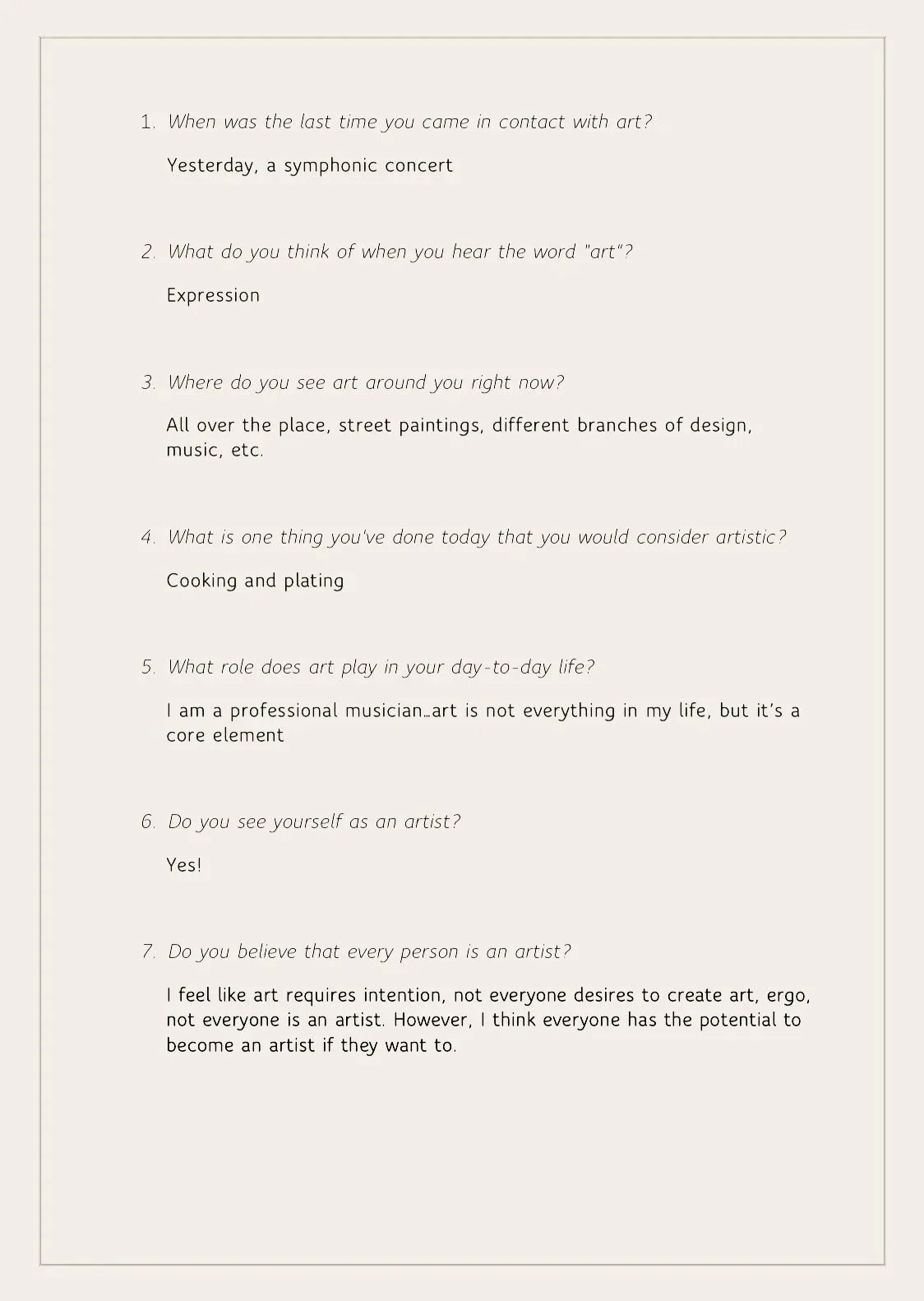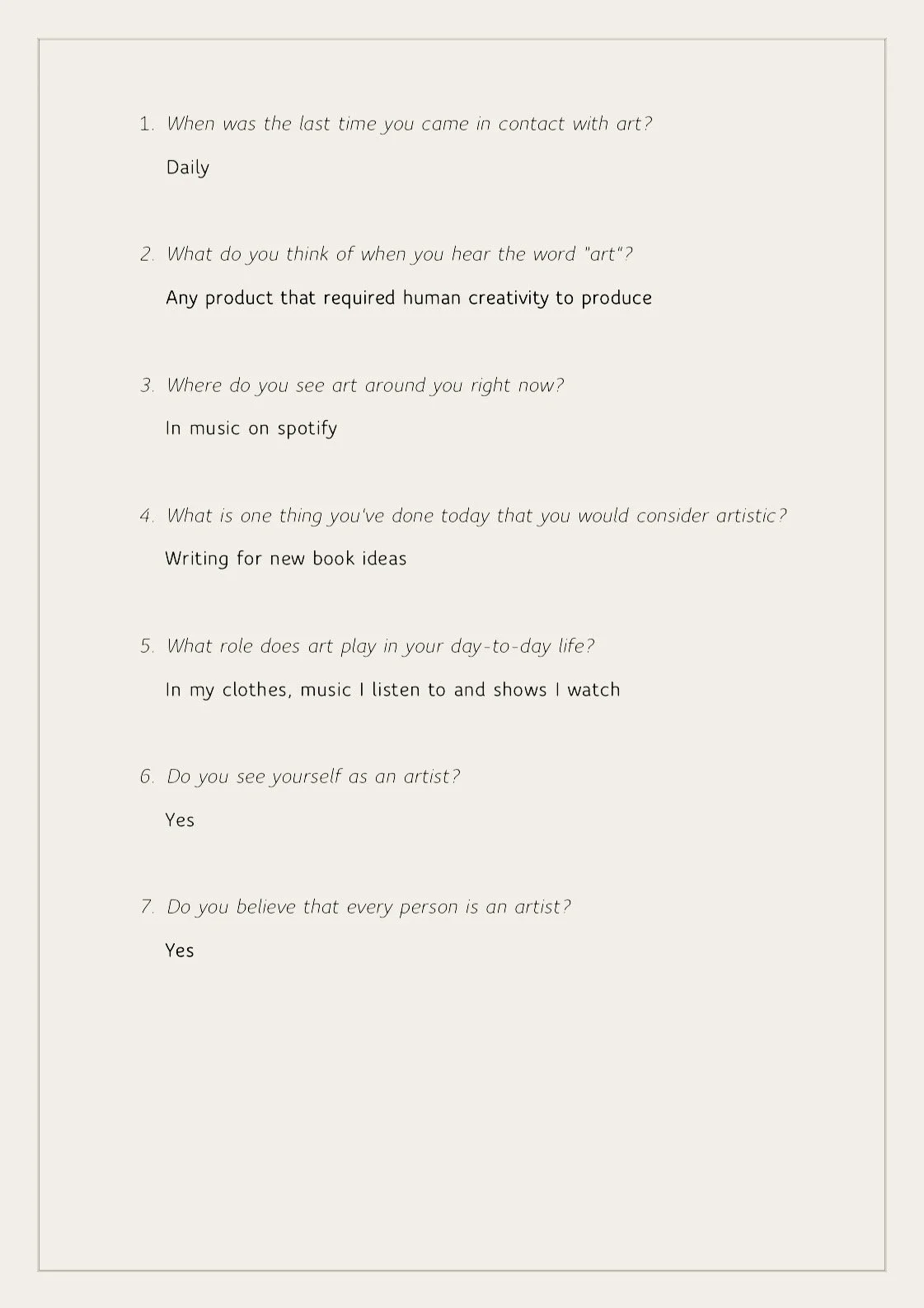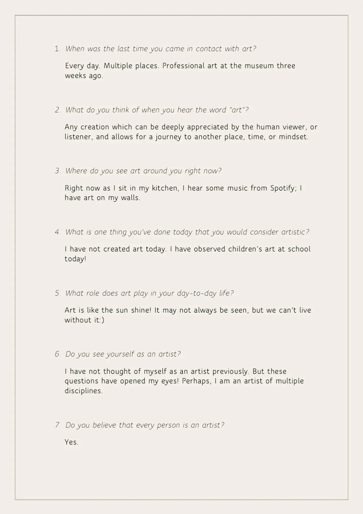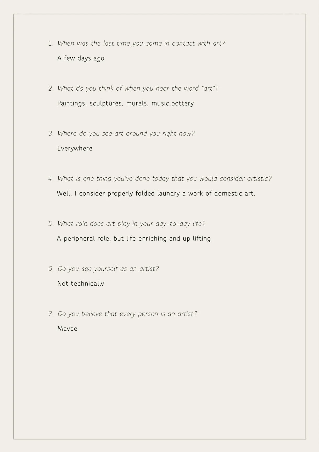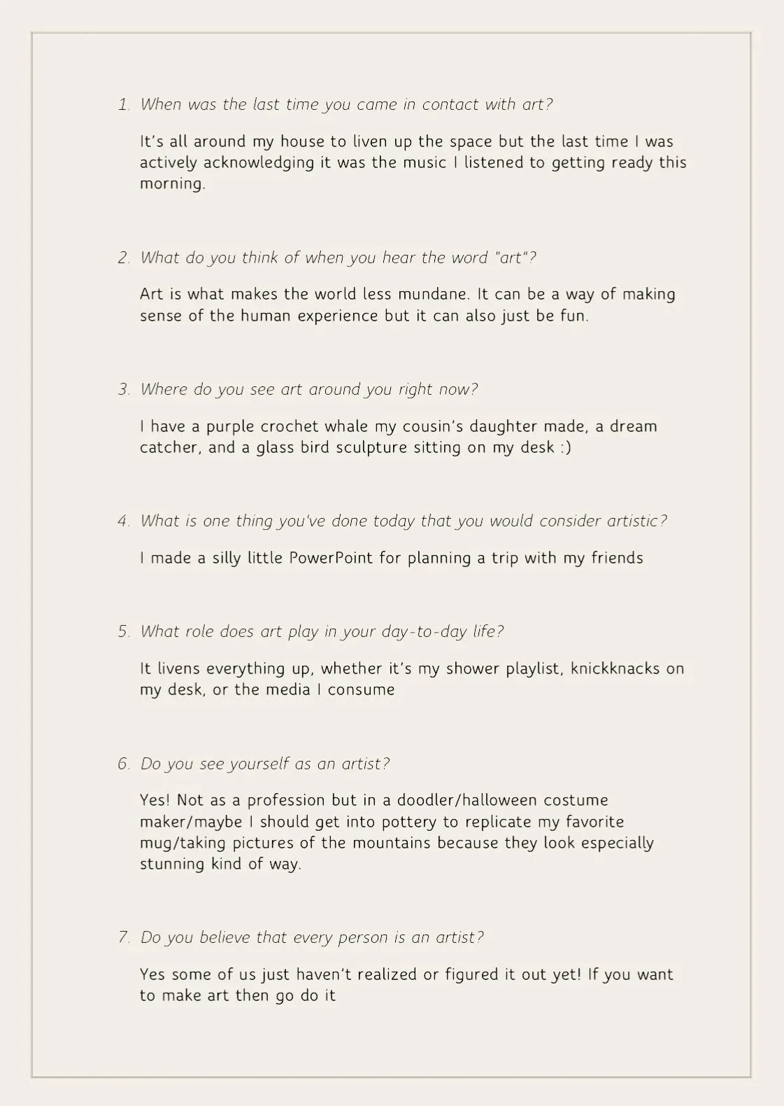 These signs of art on the street implied to me an artistry in all people. But I wanted to connect with people and gather their perspectives on it. Do people generally view themselves as artists, and even if they don’t, what kinds of artistic and creative activities are they partaking in each day? To answer these questions I created an online survey in which I asked the following: