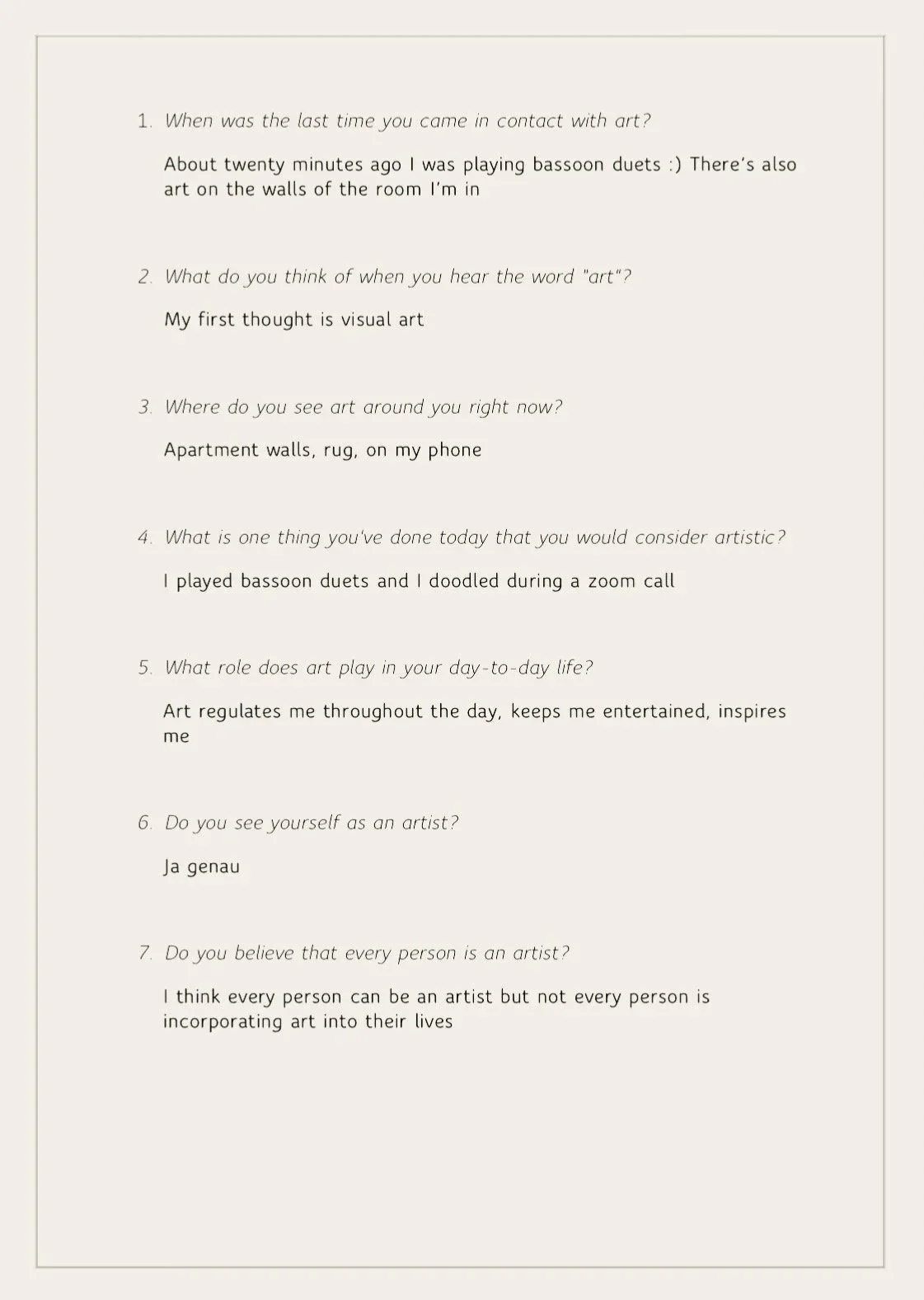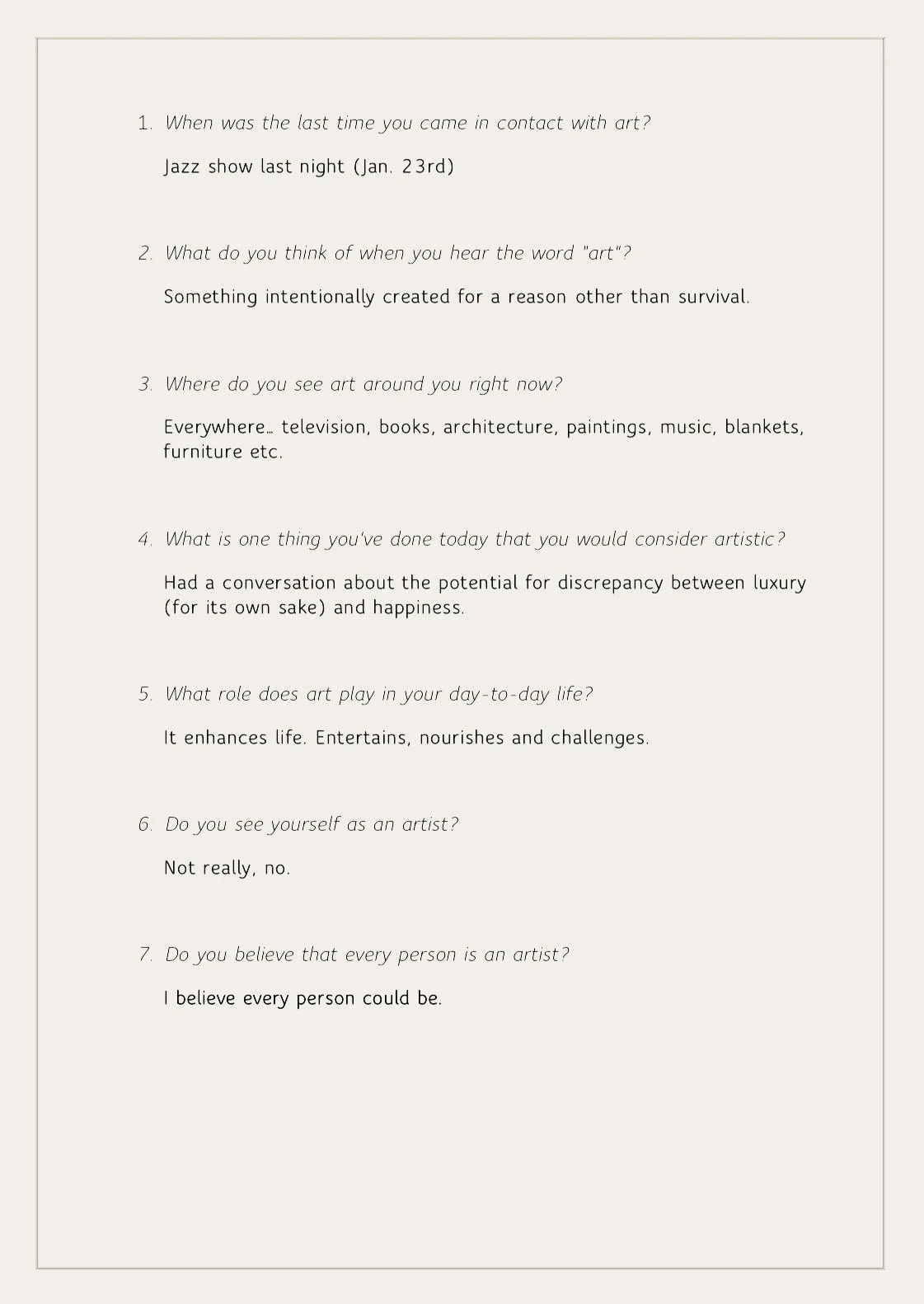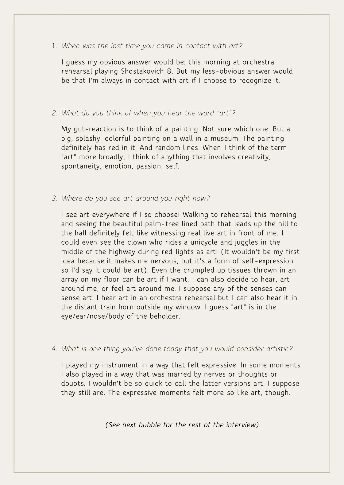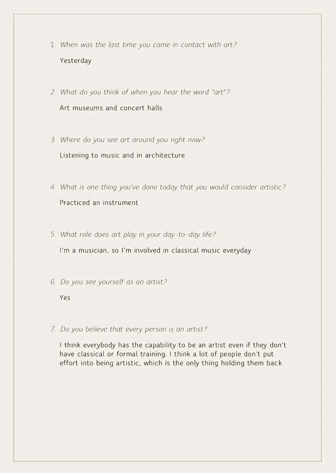 These signs of art on the street implied to me an artistry in all people. But I wanted to connect with people and gather their perspectives on it. Do people generally view themselves as artists, and even if they don’t, what kinds of artistic and creative activities are they partaking in each day? To answer these questions I created an online survey in which I asked the following: