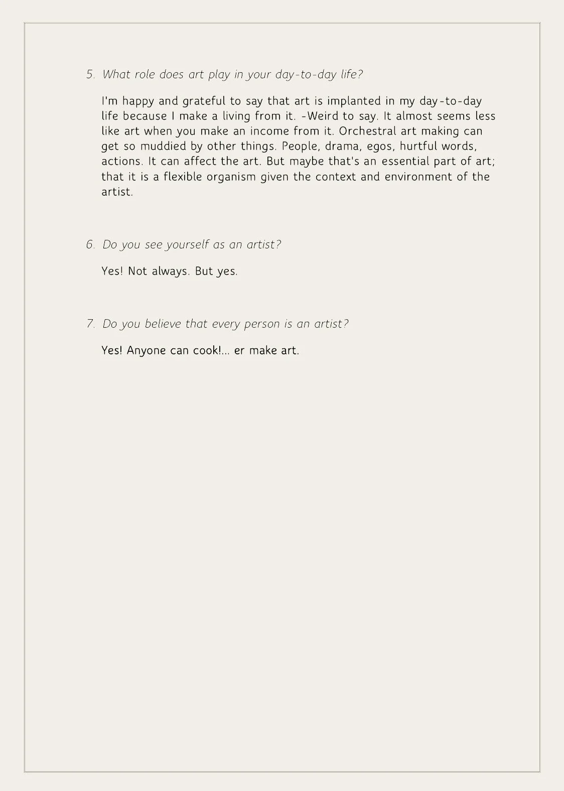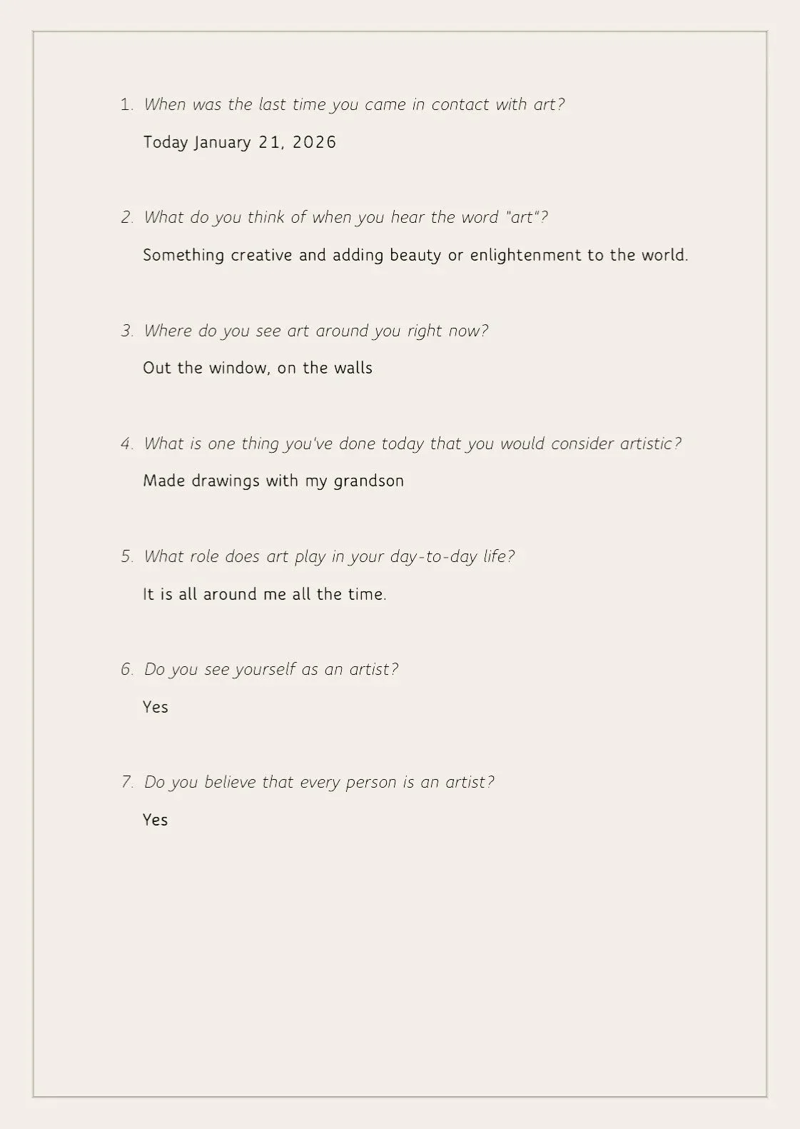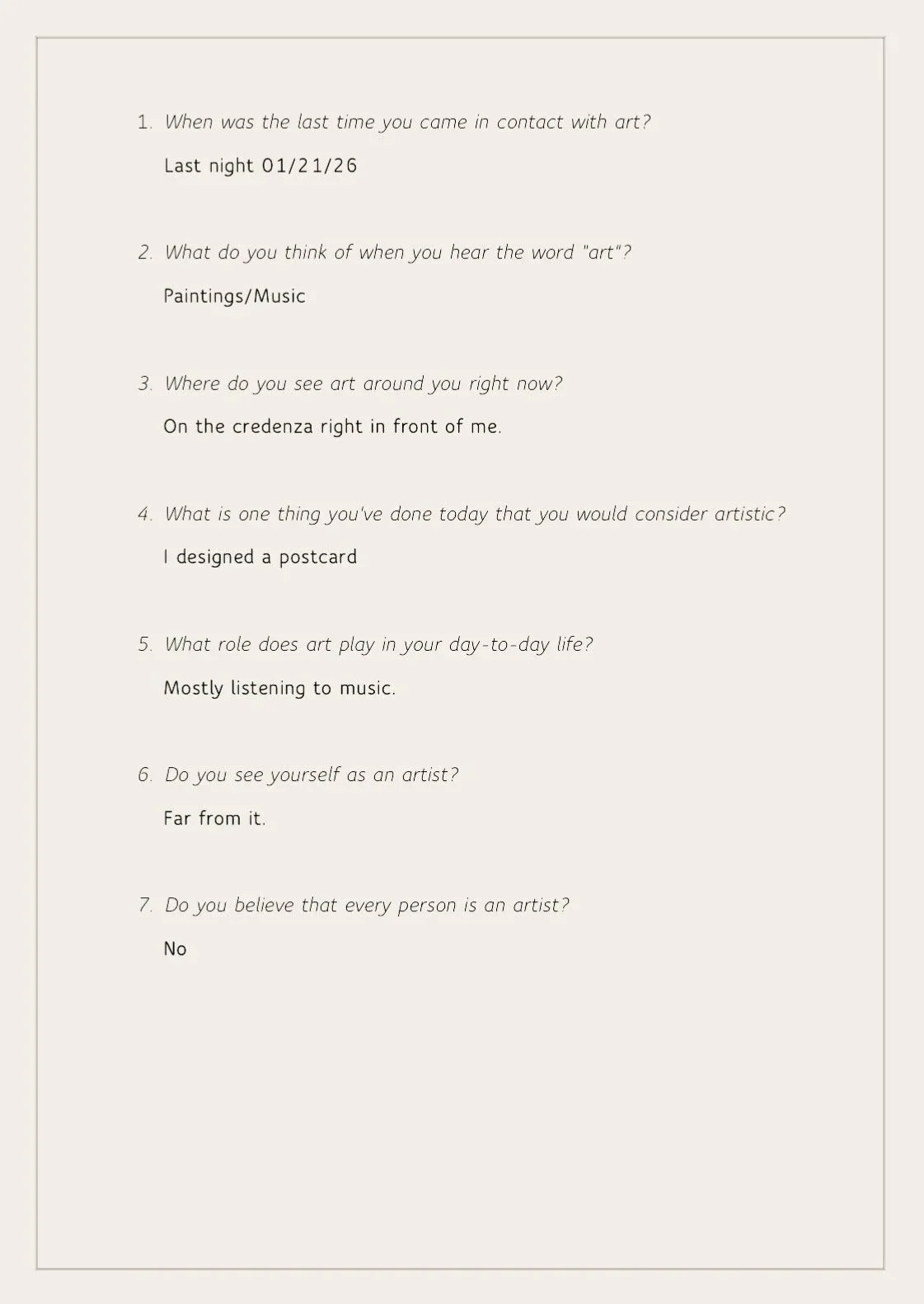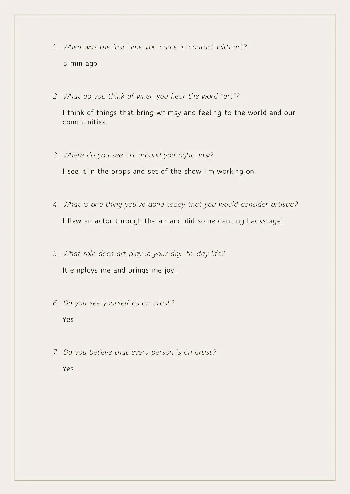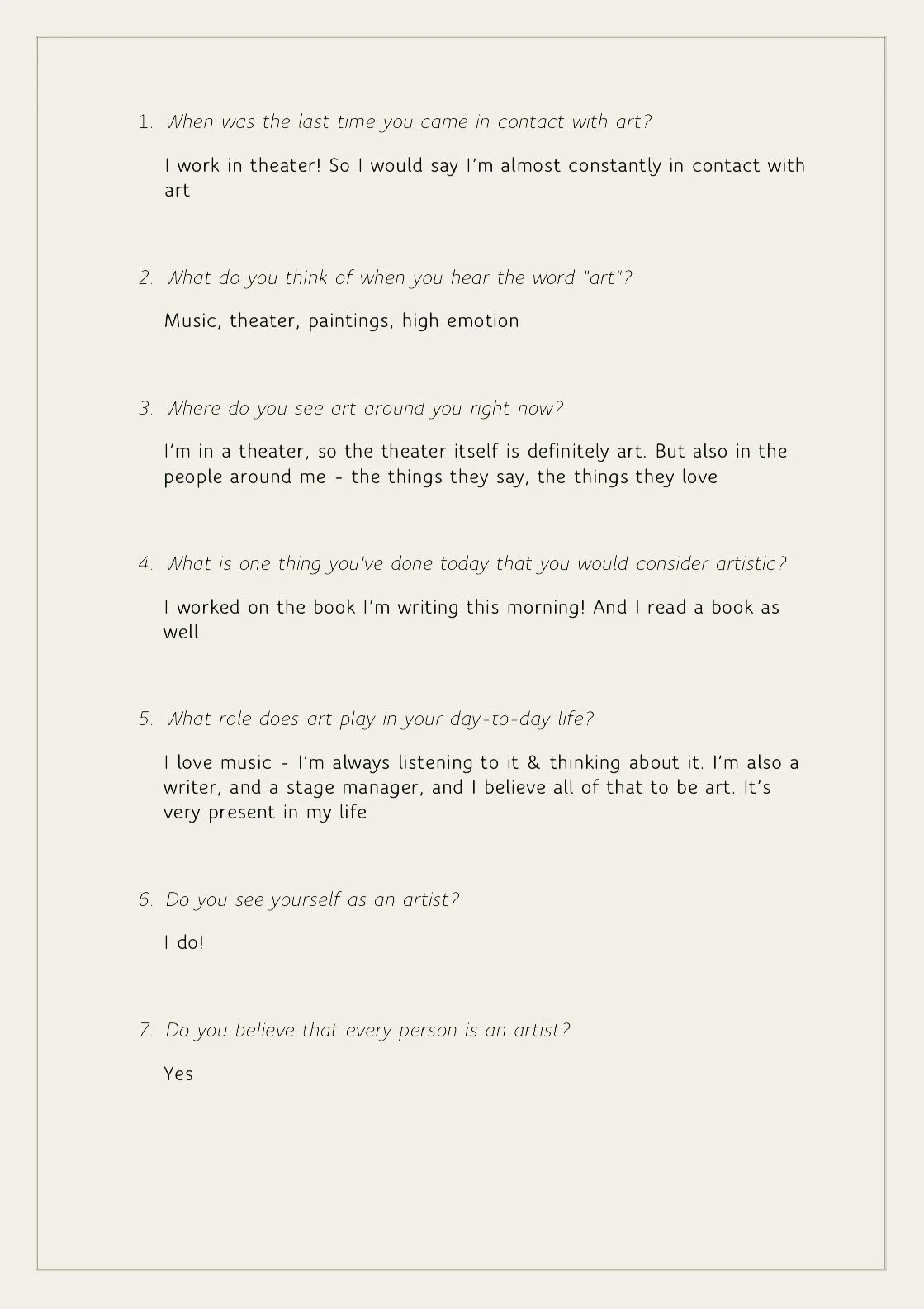These signs of art on the street implied to me an artistry in all people. But I wanted to connect with people and gather their perspectives on it. Do people generally view themselves as artists, and even if they don’t, what kinds of artistic and creative activities are they partaking in each day? To answer these questions I created an online survey in which I asked the following: