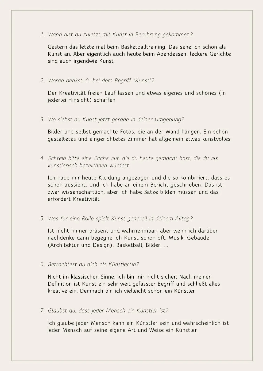 Schreib bitte eine Sache auf, die du heute gemacht hast, die du als küstlerisch bezeichnen würdest.